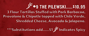 The specialty of the house, number 9 on the menu, is called The Pilewski. It’s three flour tortillas, stuffed with pork barbacoa, provolone cheese and chipotle, and topped with chile verde, shredded cheese, avocado and jalapeño peppers.